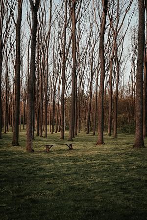 A “Lonesome Bench In The Woods” in Tayamentasachta, a school farm located in Greencastle, Pennsylvania